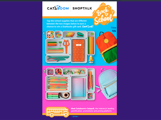 Differ is CataBoom’s take on a classic spot-the-difference game. This experience displays two images mirrored that are seemingly the same but are different. Players seek how the images differ and tap or click on each difference to accumulate points while they try to beat the clock. Game play ends when all the differences are discovered, or time runs out and can include a final exit level based on how successful a player’s eye for detail can be. Note: Differ does NOT support registration forms.